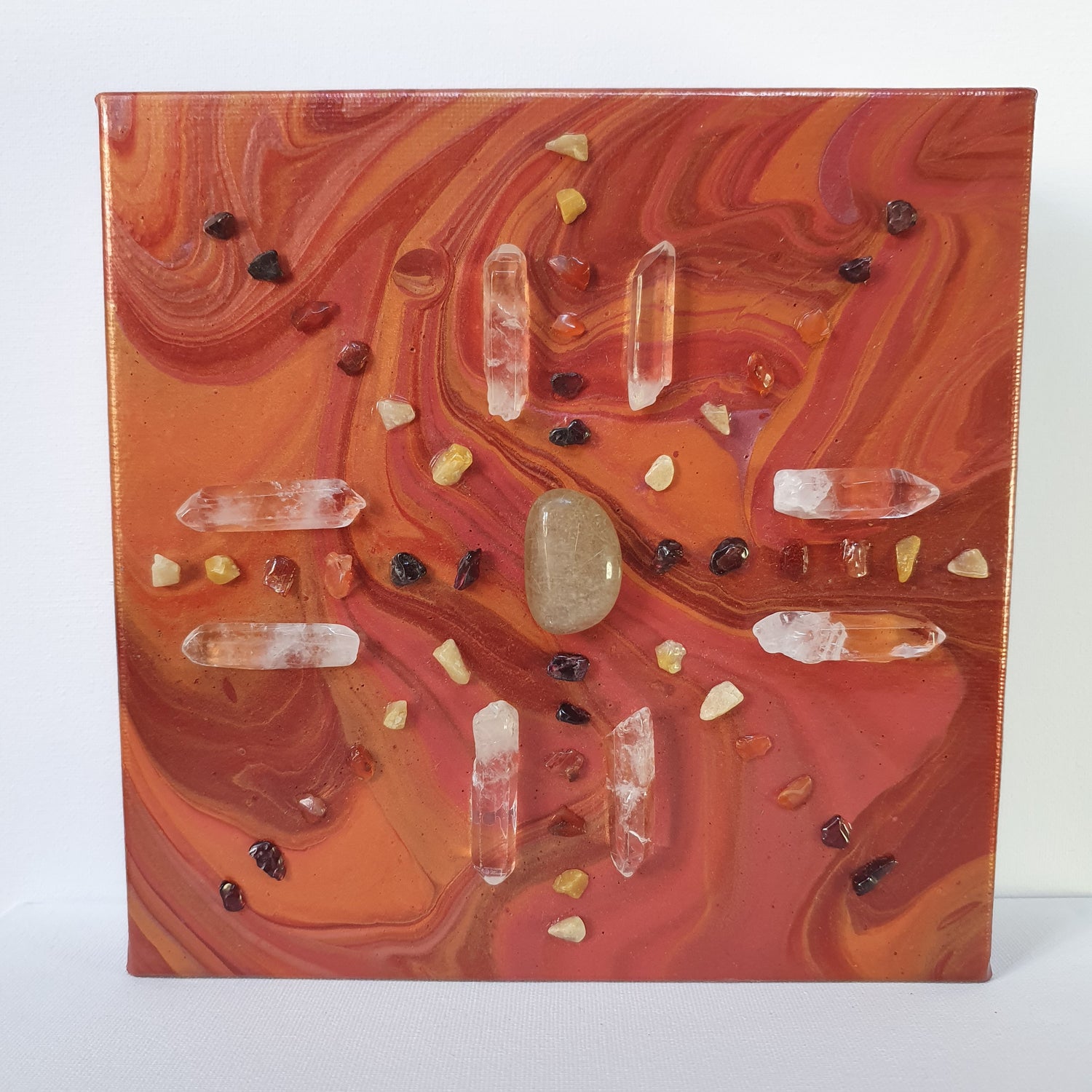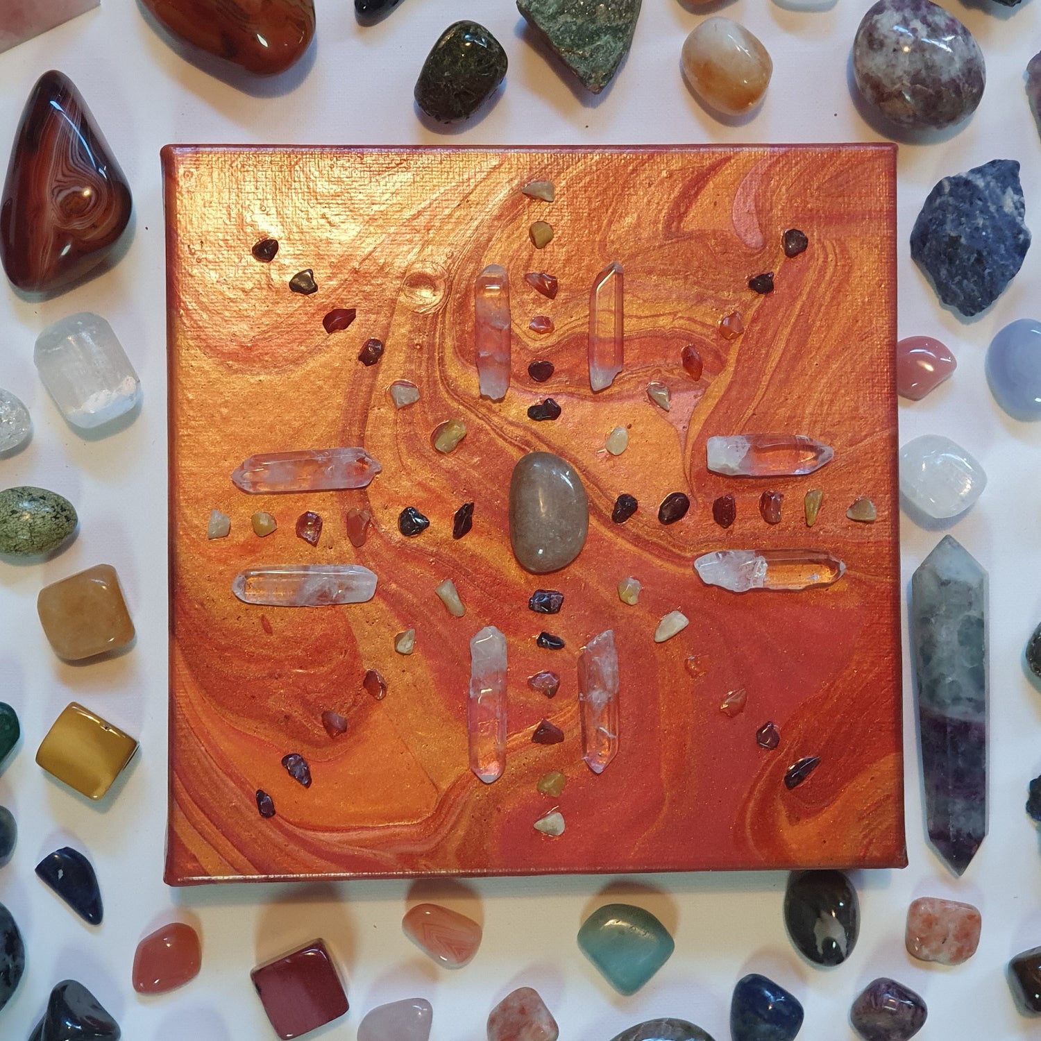 The three lower chakras are heavily manifested in this piece. Red, orange and yellow representing the root/base chakra, sacral chakra and solar plexus chakra respectively. Having these three chakras vibrating high allows one to be grounded into the 3D reality around them and helping one to feel safe and supported. Whilst the centre stone of this crystal grid is Rutilated Quartz is a high vibration stone promoting ones connection to the Divine. By bringing in the grounded energies of Garnet, Carnelian and Yellow Adventurine and the expansive energies of Clear and Rutilated Quartz, it allows one to be ground into reality, whilst they explore their spiritual practice, making it easier to use the wisdoms they gain in mediation and other spiritual practice in everyday life.