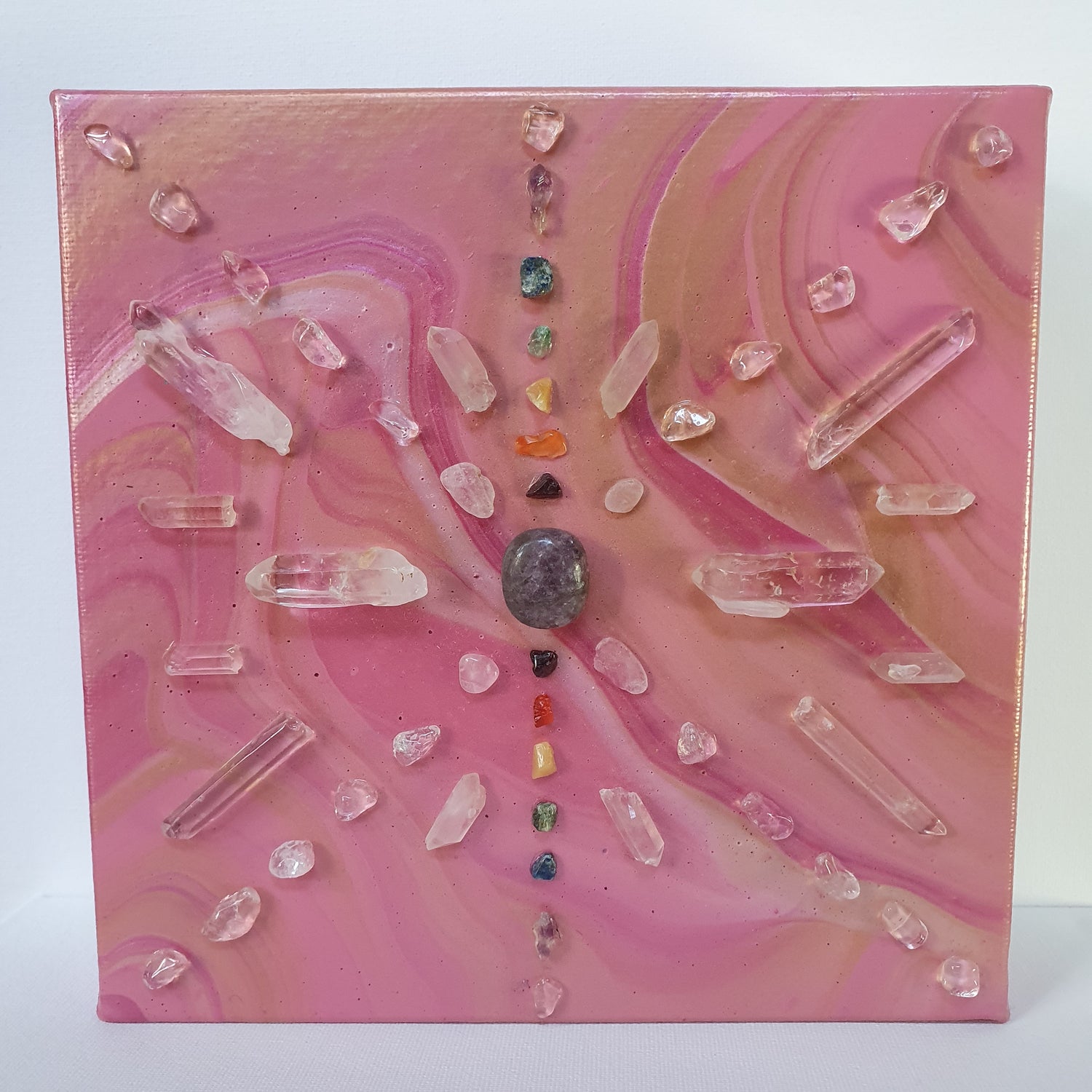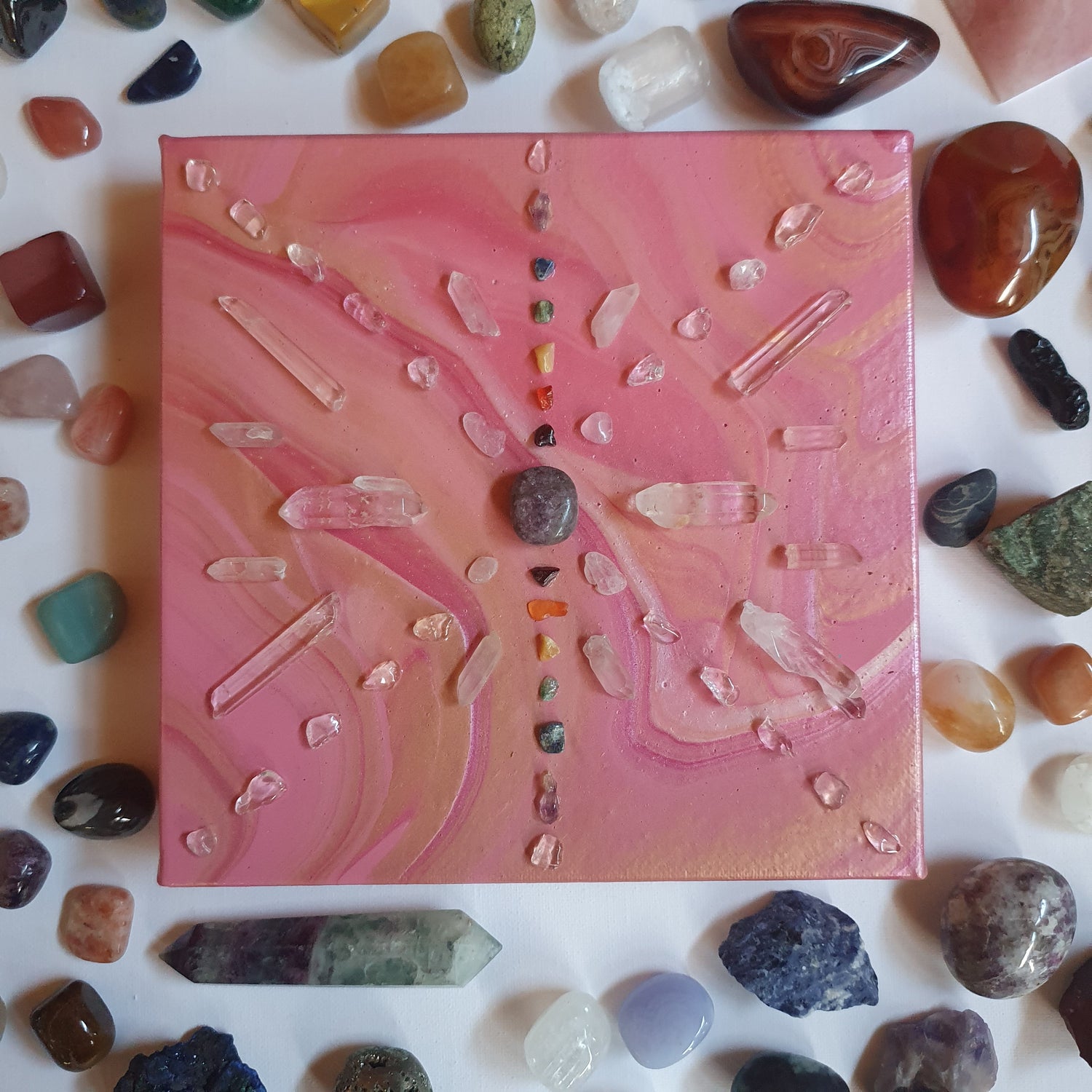 The centre stone in this crystal grid, Lepidolite is a stone used to assist you on your path to spiritual ascension. The chakra stones on the grid is to help one align and activate their charkas whilst on this spiritual ascension process as well as the Clear Quartz points helping to radiate the energy all around you. The smooth, background of soft pinks is to help bring for the energy of unconditional love for yourself and all living things, so you may go through your spiritual expansion surrounded in love and light.
