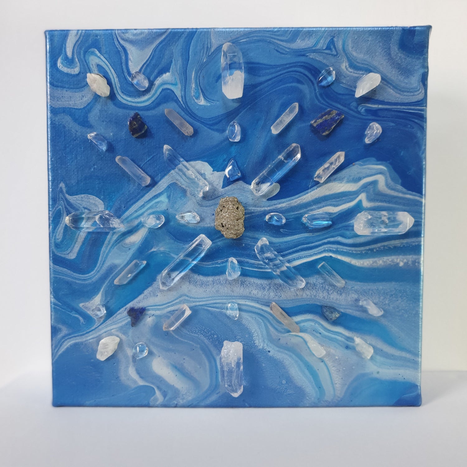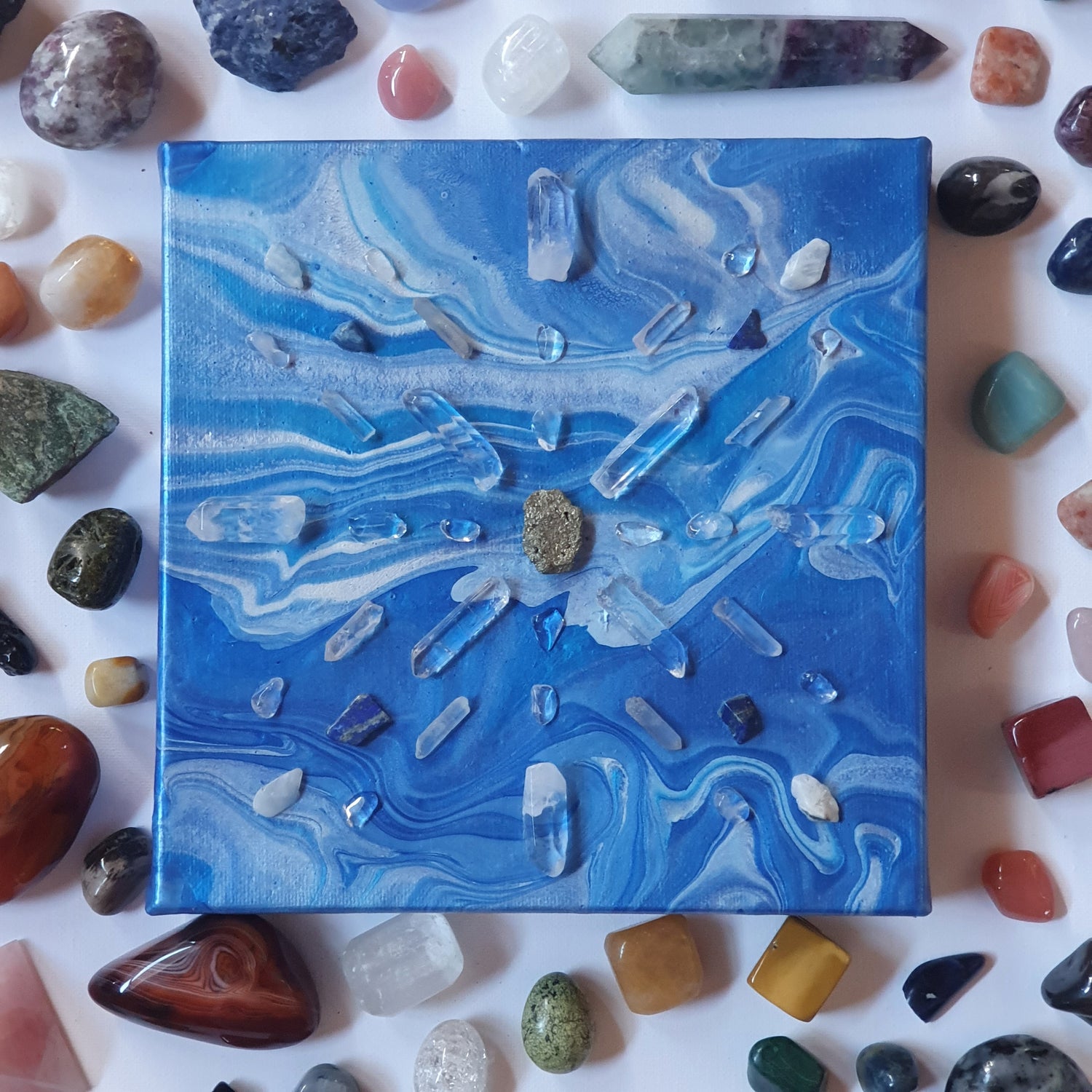The waves of healing blue energy in this piece helps you to connect to your Throat Chakra and speak your truth with wisdom and confidence. The centre stone of Pyrite is an excellent tool to work with to increase the flow of the Solar Plexus chakra- the source of self confidence. Using this grid to activate these chakras and committing to the mantra of "I am Confident" everyday is sure to make a positive shift in your self-worth journey.